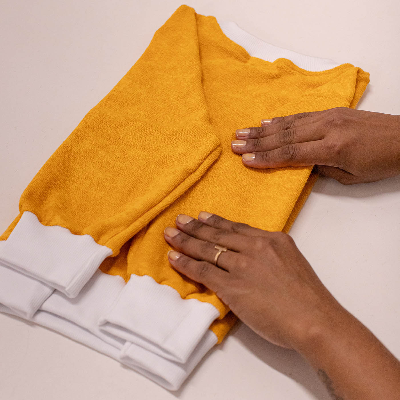 Quando uma produção termina, é uma verdadeira alegria para a marca e para o ateliê. O orgulho de uma equipe que verificou cuidadosamente cada peça, não deixando nada ao acaso: as costureiras cortaram os últimos fios, passaram, dobraram.